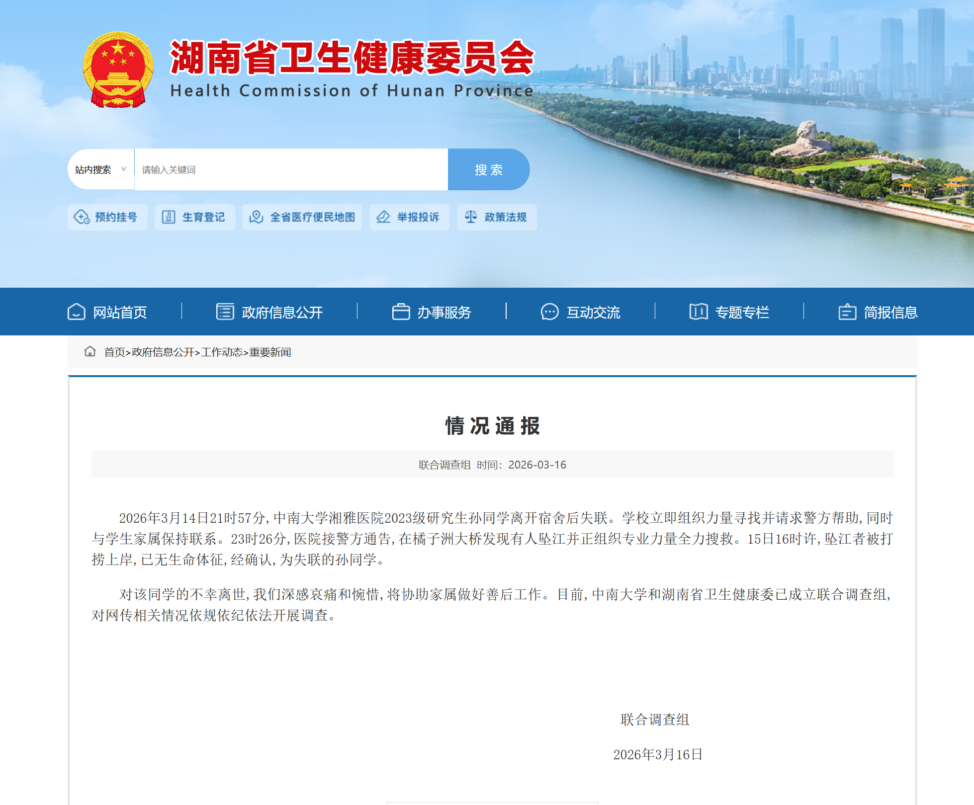 近日,中南大学湘雅医院2023级硕士研究生孙同学失联事件引发广泛关注。随即,中南大学和湖南省卫健委组成联合调查组,并发通报称,孙同学确认坠江身亡,对网传相关情况依规依纪依法开展调查。目前,孙同学的导师谷某某已暂停接诊,相关调查工作正在展开。